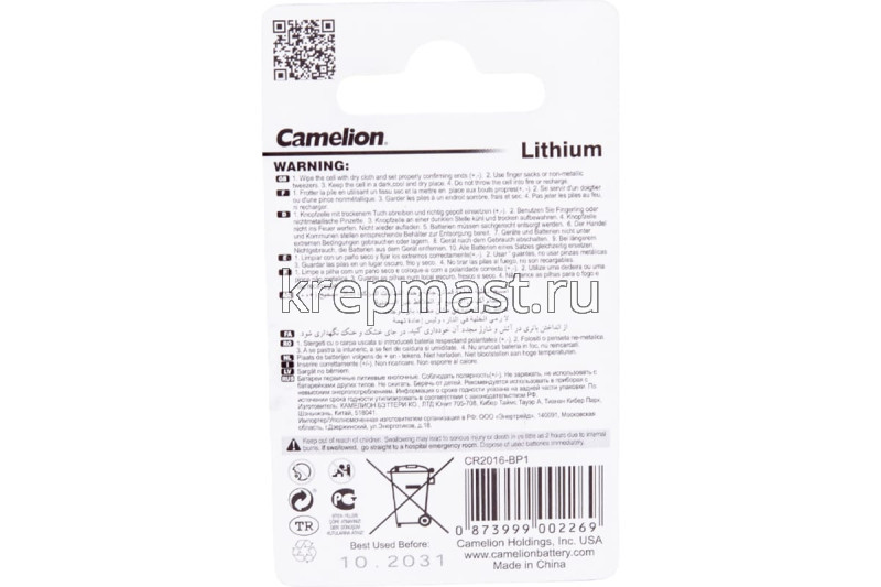 Батарейка Camelion CR2016 в интернет-магазине «Мастер Крепежа» по цене 66 руб. Более 12 наименований товаров в наличии в категории Батарейка ТАБЛЕТКА. Купить батарейка camelion cr2016 в Пестрецы выгодно Вы можете on-line на нашем сайте, или отправив заявку по почте, а также по телефону или в пункте выдачи компании г. Казань, ул. Татарстан, 9, магазин "Мастер Крепежа". Доставка по Республике Татарстан и другие регионы РФ.