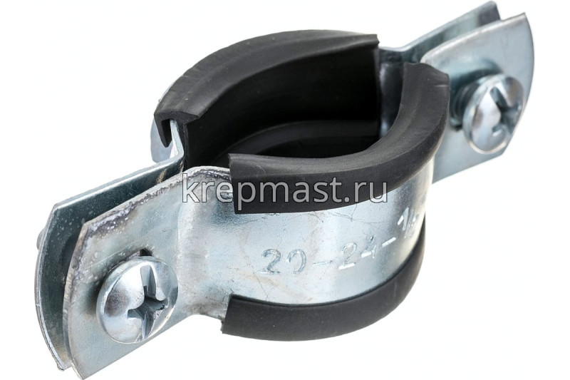 Хомут сантехнический с гайкой 20-24 мм представляет собой две металлические пластины, соединенные по краям регулировочными винтами м5 и резиновым уплотнителем. К хомуту приварена гайка м8 с метрической резьбой. Диаметр обжима трубы составляет от 20 до 24 мм. Изготавливается из оцинкованной стали толщиной 1 мм.