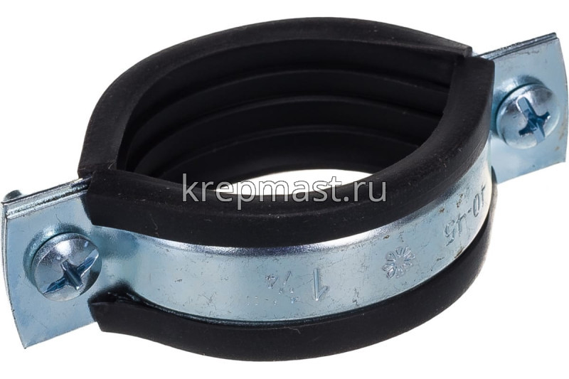 Хомут сантехнический с гайкой 40-45 мм представляет собой две металлические пластины, соединенные по краям регулировочными винтами м6 и резиновым уплотнителем. К хомуту приварена гайка м8 с метрической резьбой. Диаметр обжима трубы составляет от 40 до 45 мм. Изготавливается из оцинкованной стали толщиной 1.2 мм.