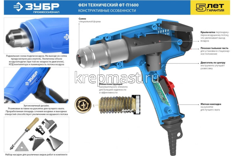 Фен ЗУБР (1600Вт, 350-550С ) в интернет-магазине «Мастер Крепежа» по цене 4477 руб. Более 9 наименований товаров в наличии в категории Фены технические. Купить фен зубр (1600вт, 350-550с ) в Пестрецы выгодно Вы можете on-line на нашем сайте, или отправив заявку по почте, а также по телефону или в пункте выдачи компании г. Казань, ул. Татарстан, 9, магазин "Мастер Крепежа". Доставка по Республике Татарстан и другие регионы РФ.