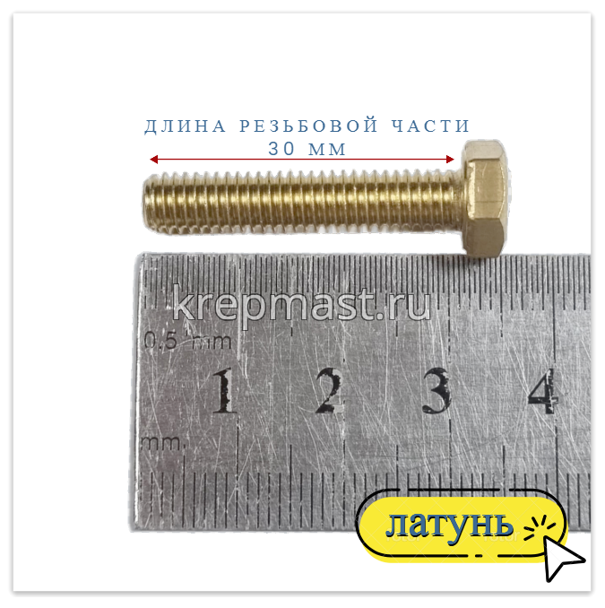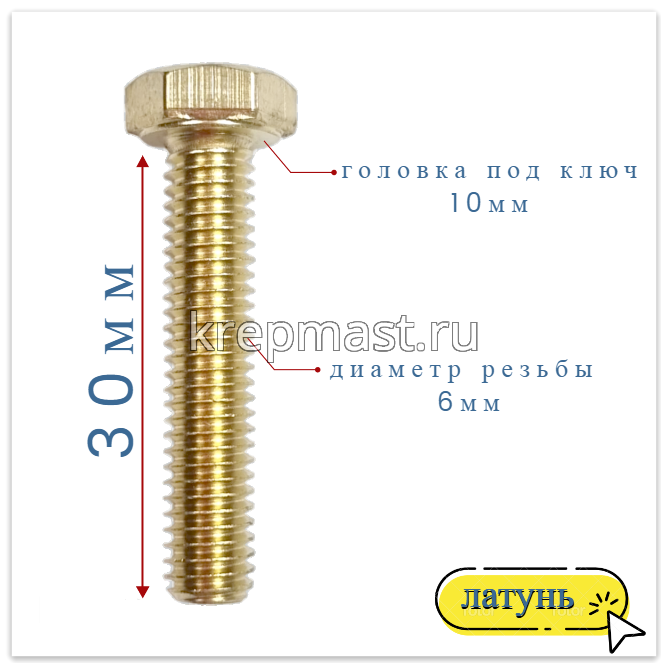 Болт 6х30 DIN 933 латунь в интернет-магазине «Мастер Крепежа» по цене 61 руб. Более 26 наименований товаров в наличии в категории Болты латунные DIN 933. Купить болт 6х30 din 933 латунь в Пестрецы выгодно Вы можете on-line на нашем сайте, или отправив заявку по почте, а также по телефону или в пункте выдачи компании г. Казань, ул. Татарстан, 9, магазин "Мастер Крепежа". Доставка по Республике Татарстан и другие регионы РФ.