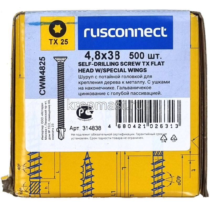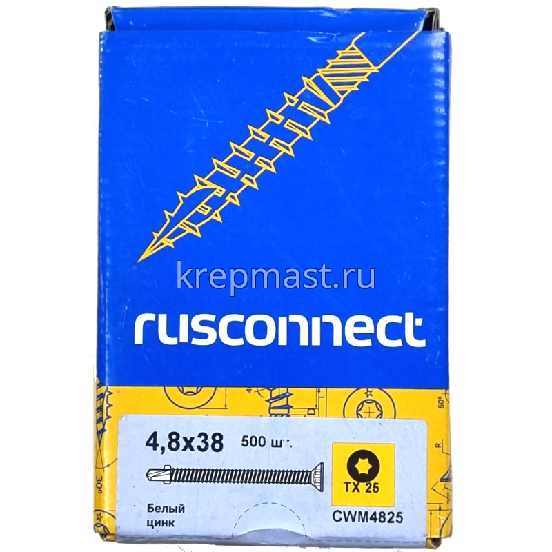 Саморез кровельный ТХ20 с ушками без шайбы DIN 7504 P 4,8х38 потай. - сверло оцинк. Rusconnect применяется для крепления деревянной доски к металлической обрешетке. На острие самореза находится бур с двумя выступающими "ушками", которые свободно проходят через древесину и обламываются, когда саморез достигает металла. На нижней стороне потайной головки есть несколько выступов предназначенных для самозенковки и аккуратного утапливания заподлицо с поверхностью. Помимо досок данными саморезами можно крепить фанеру, ДСП и плиты МДФ.