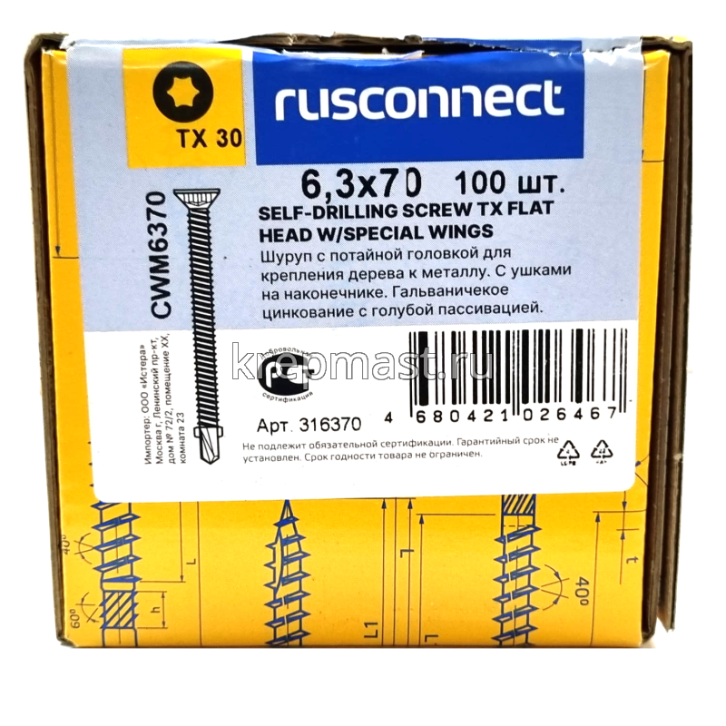 Саморез кровельный ТХ30 с ушками без шайбы DIN 7504 P 6,3х70 потай. - сверло оцинк. Rusconnect применяется для крепления деревянной доски к металлической обрешетке. На острие самореза находится бур с двумя выступающими "ушками", которые свободно проходят через древесину и обламываются, когда саморез достигает металла. На нижней стороне потайной головки есть несколько выступов предназначенных для самозенковки и аккуратного утапливания заподлицо с поверхностью. Помимо досок данными саморезами можно крепить фанеру, ДСП и плиты МДФ.