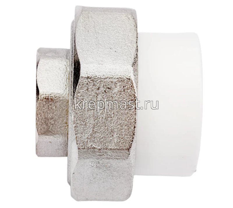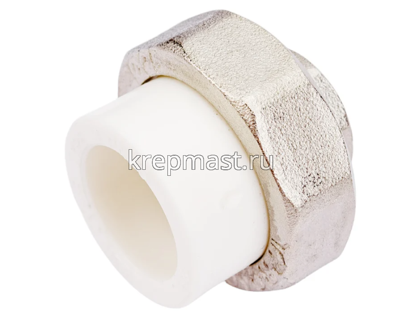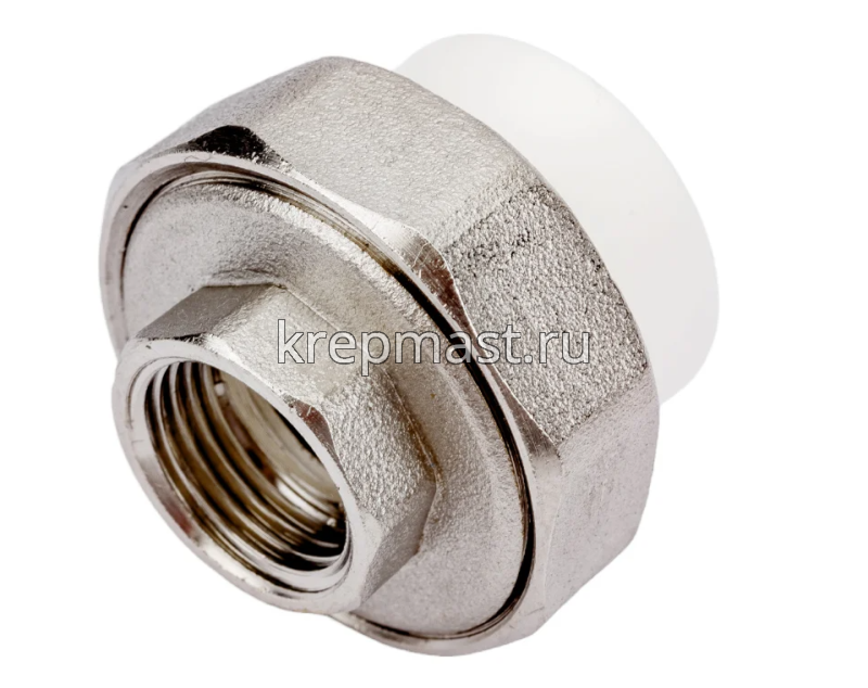 Комбинированная разъемная муфта (американка) ВР D 25 - 1/2 п/п - разъемная муфта состоит из двух элементов, один из которых приваривается к полипропиленовой трубе посредством раструбной сварки, другой - соединяется с оборудованием или арматурой при помощи трубной резьбы.