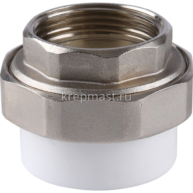 Комбинированная разъемная муфта (американка) ВР D 40- 1 1/4 п/п - разъемная муфта состоит из двух элементов, один из которых приваривается к полипропиленовой трубе посредством раструбной сварки, другой - соединяется с оборудованием или арматурой при помощи трубной резьбы.