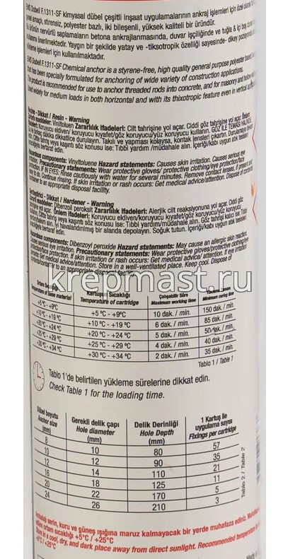 Применение продукта | крепление тяжеловес. элементов к тверд. камню и бетону, крепл. анкерных,армат. стержней, шурупов |