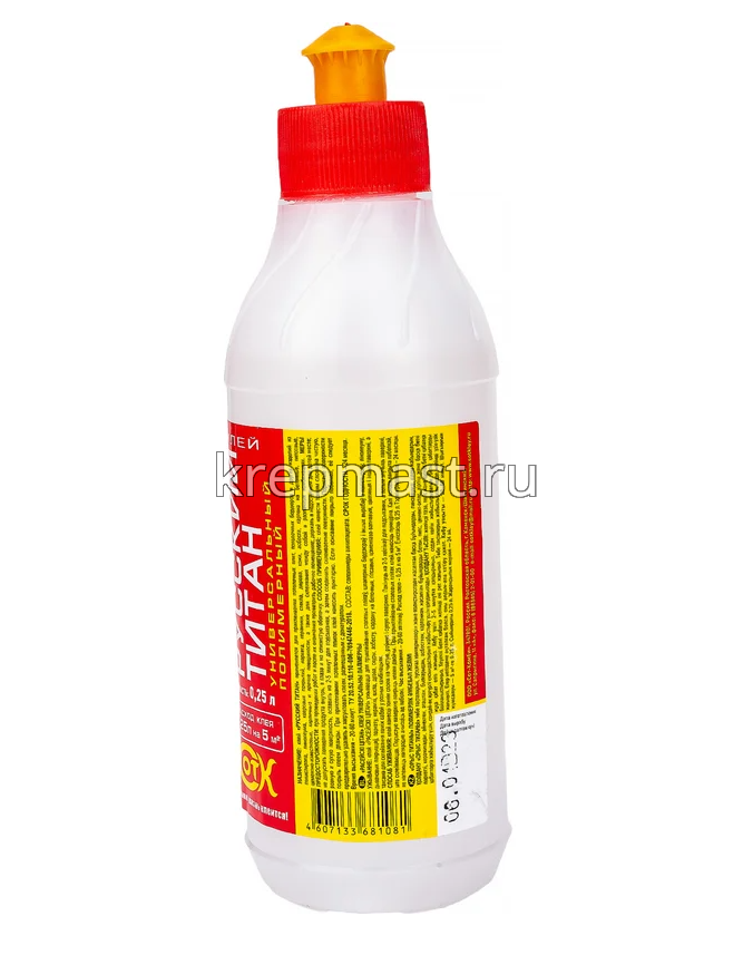 Универсальный полимерный клей РУССКИЙ ТИТАН (морозоустойчивый; 0.25 л) предназначен для наклеивания изделий из пенополистирола, экструдированного пенополистирола, глазури, паркета, паркетной мозаики, керамики, напольных ковровых покрытий, дерева, дерево-подобных материалов, пробки, искусственной кожи, бумаги, ткани. Применяется для склеивания вышеперечисленных материалов друг с другом и в разных комбинациях, а также для приклеивания этих материалов к бетонным, цементно- известковым, гипсовым, штукатурным и кирпичным поверхностям. Клей создает водонепроницаемый шов.